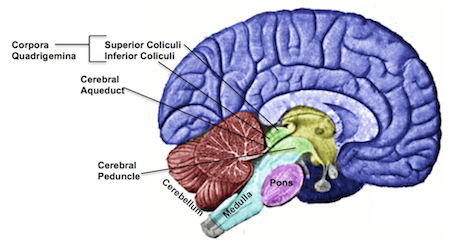 What is "MID-BRAIN"? ![]() The midbrain is an area of the brain that, as you might have guessed, is in the middle of two other regions: the forebrain and the hindbrain. The forebrain is the 'front' (fore) brain and is composed of the cerebral cortex, the area that most people think of as the 'brain'; it's the 'super computer' of the human body. The hindbrain, or 'back' (hind) brain, is composed of the cerebellum and the pons and medulla oblongata (or medulla, for short) of the brainstem; it is evolutionarily the oldest part of our brain, controlling primal instincts and automated actions of the body, such as our 'fight or flight' response and heart rate. The midbrain, on the other hand, acts most notably as the information superhighway connecting these two regions. It enables your brain to integrate sensory information from your eyes and ears with your muscle movements, thereby enabling your body to use this information to make fine adjustments to your movements. ![]() |